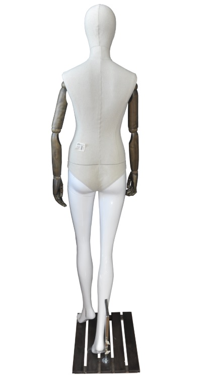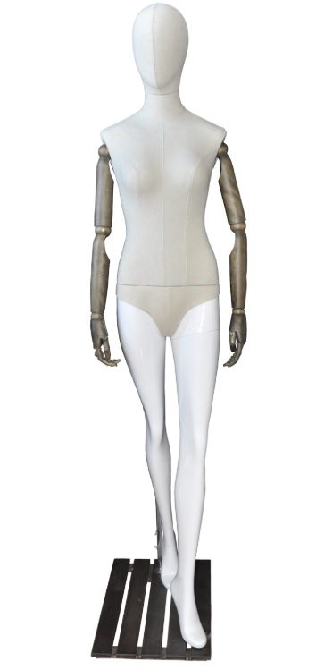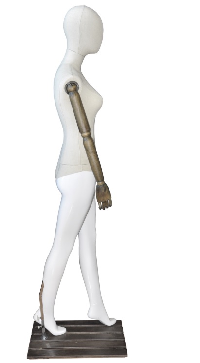 MANIQUÍ ABSTRACTO DE MUJER ANDANDO REVESTIDO EN LINO EN 2 VARIEDADES, CON BRAZOS ARTICULADOS DE MADERA Y PIERNAS EN BLANCO LACADO