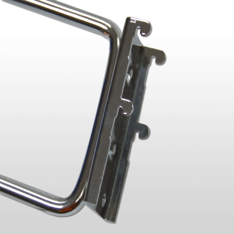 Nuestros ganchos para panel perforado están fabricados en hierro cromado y encajan perfectamente en cualquier panel perforado con orificios de 5 mm y una separación entre ellos de 25 mm.