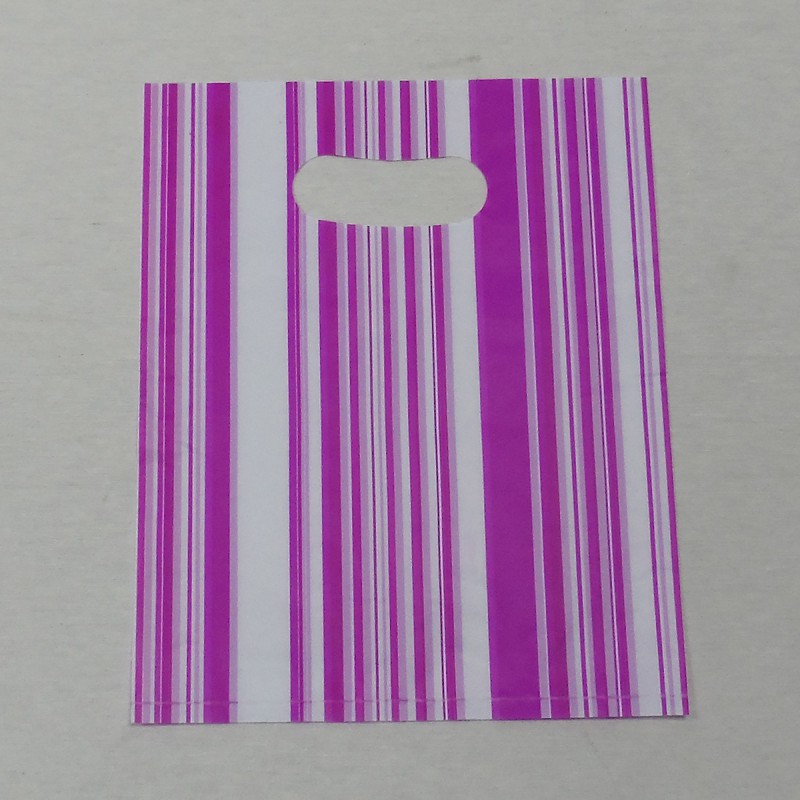 La bolsa de plástico es completamente recta en sus lados y dispone de un asa troquelada. Los bordes son lisos y están termosellados.
