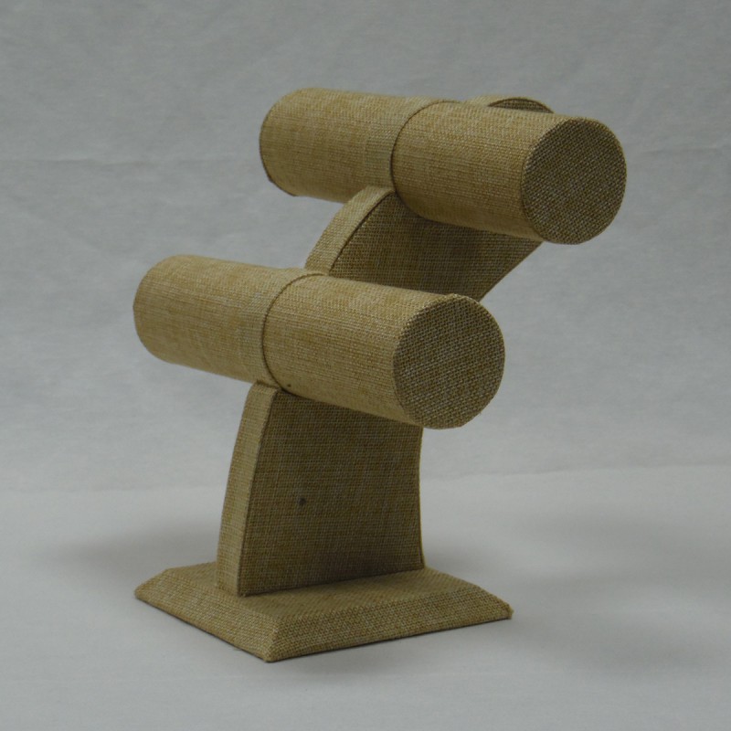 Elegante y original expositor para pulseras con dos niveles. Está fabricado en PVC y recubierto de cuerda, tipo esparto, en color beige.