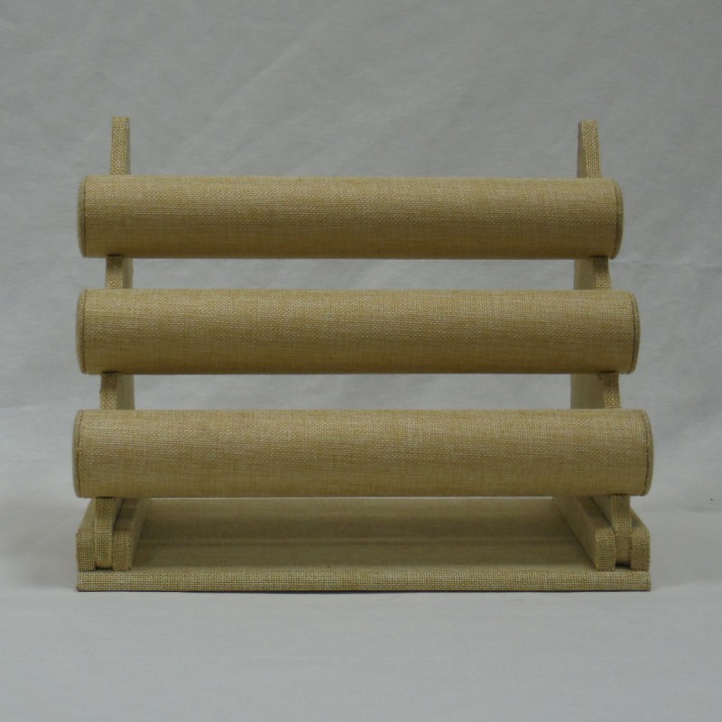 Expositor para pulseras de tres niveles, con acabados de cuerda en color beige.