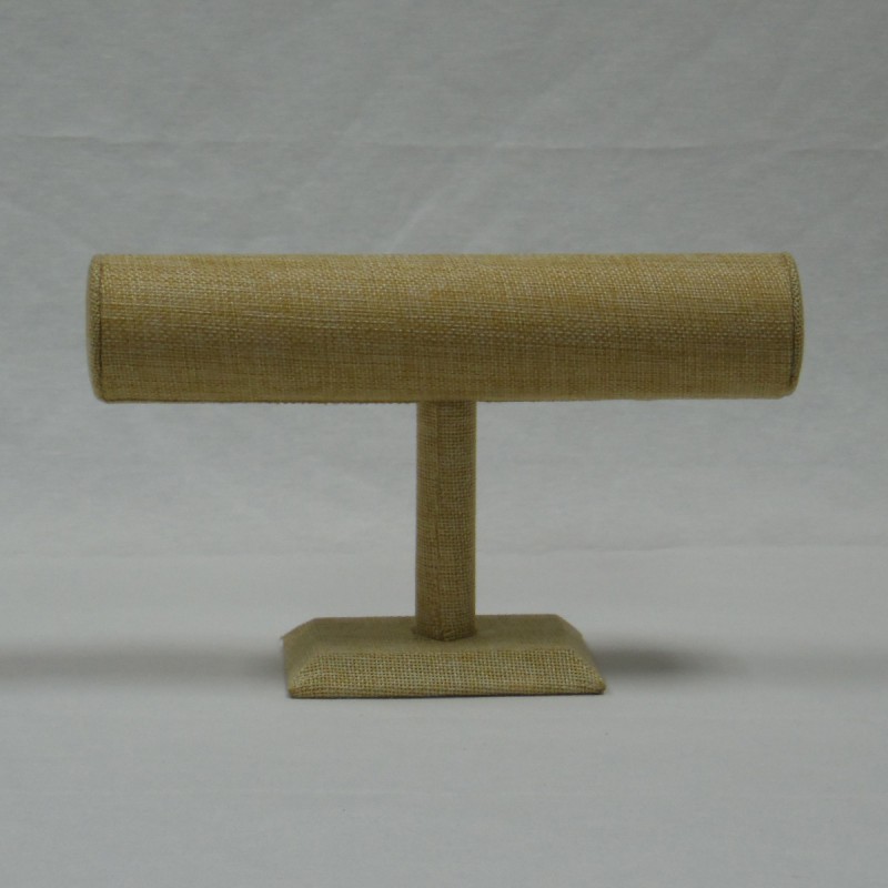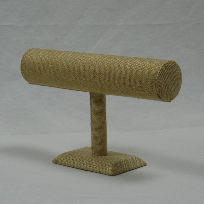 Elegante y original expositor para pulseras. Está fabricado en PVC y recubierto de cuerda, tipo esparto, en color beige.