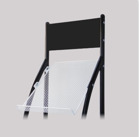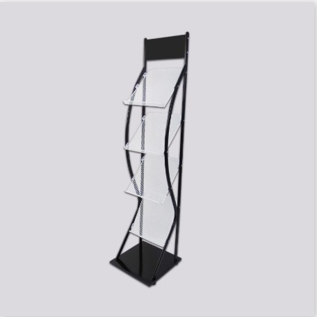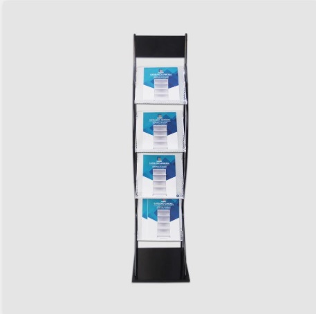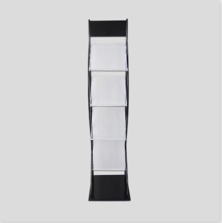 Expositor metálico para revistas con 4 bandejas inclinadas.