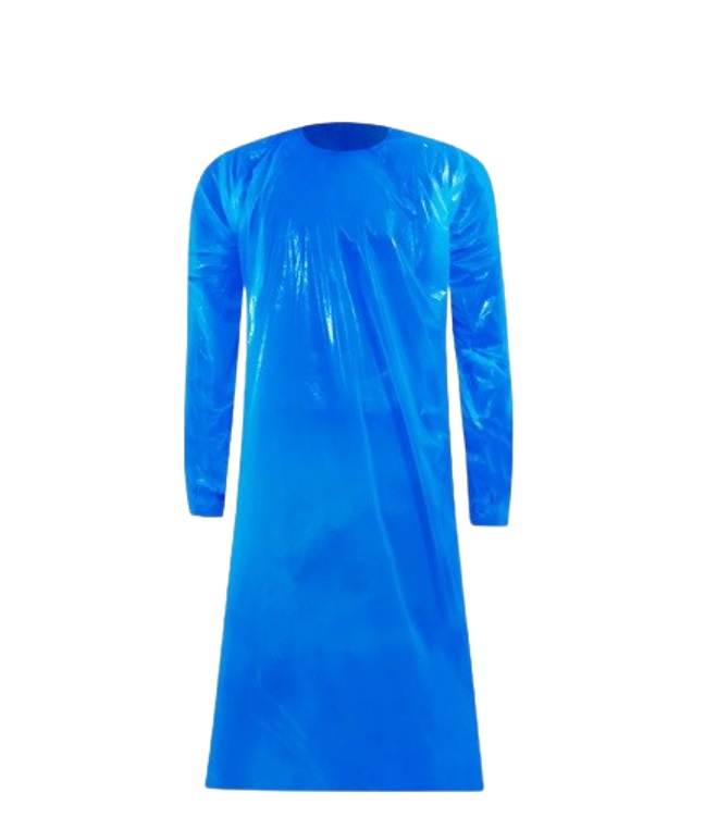 Bata/Delantal de Alta Protección en Polietileno rugoso CPE, cierre mediante cinta trasera, apertura en cuello con ajuste y manga larga con puño engarzado en dedo pulgar. Medidas: Talla L – 118 cm. Colores Disponibles: Azul