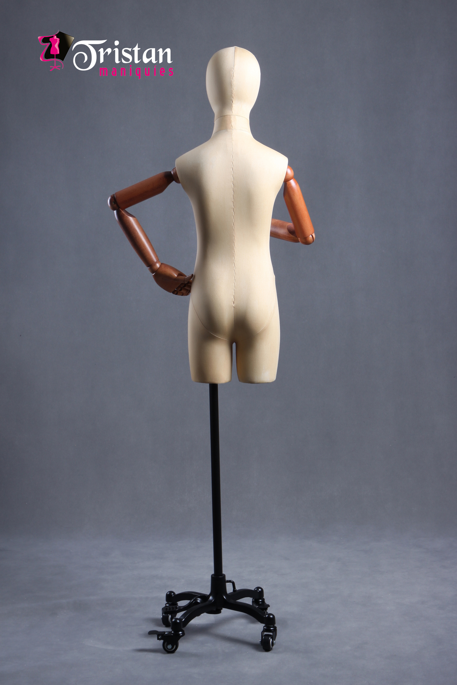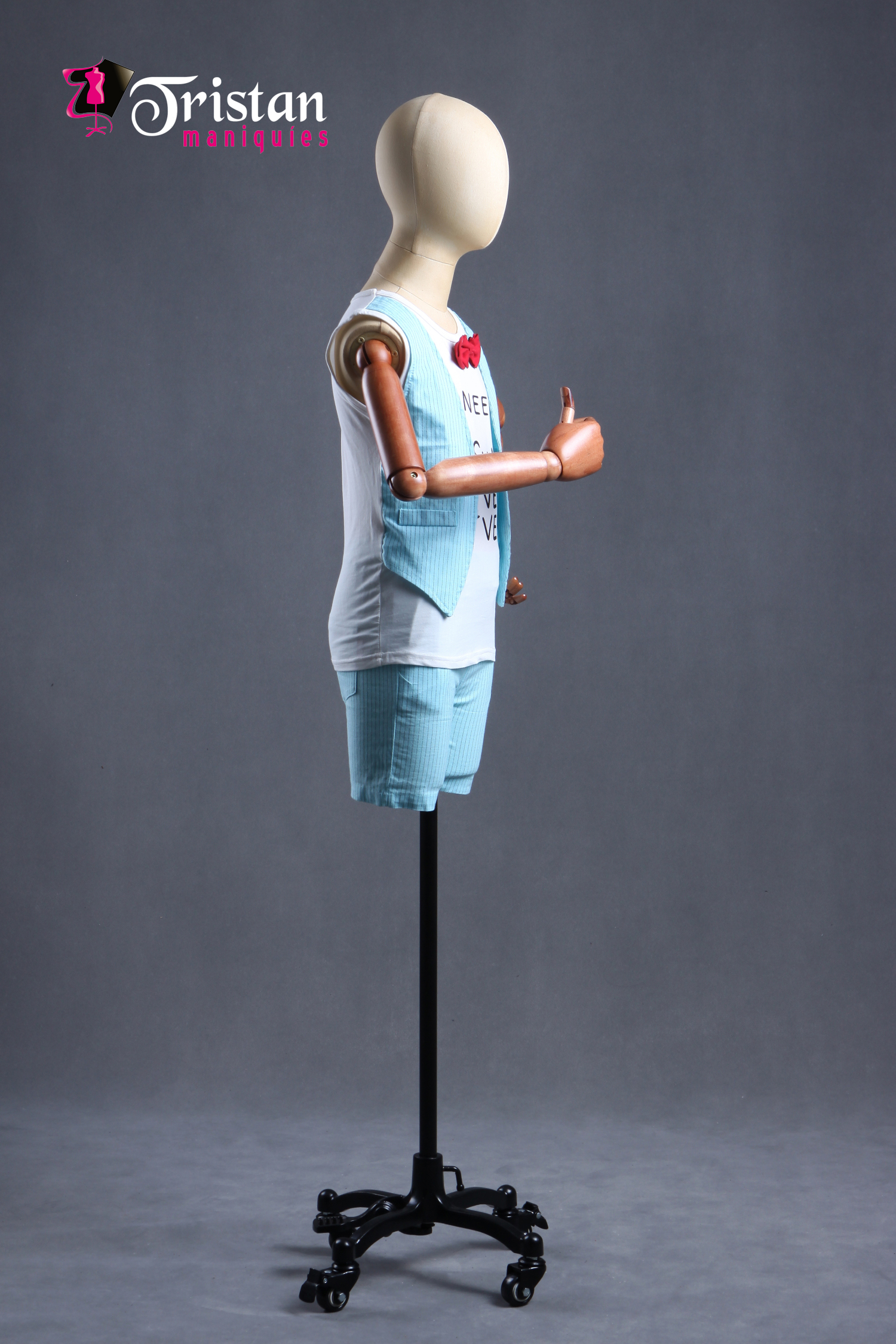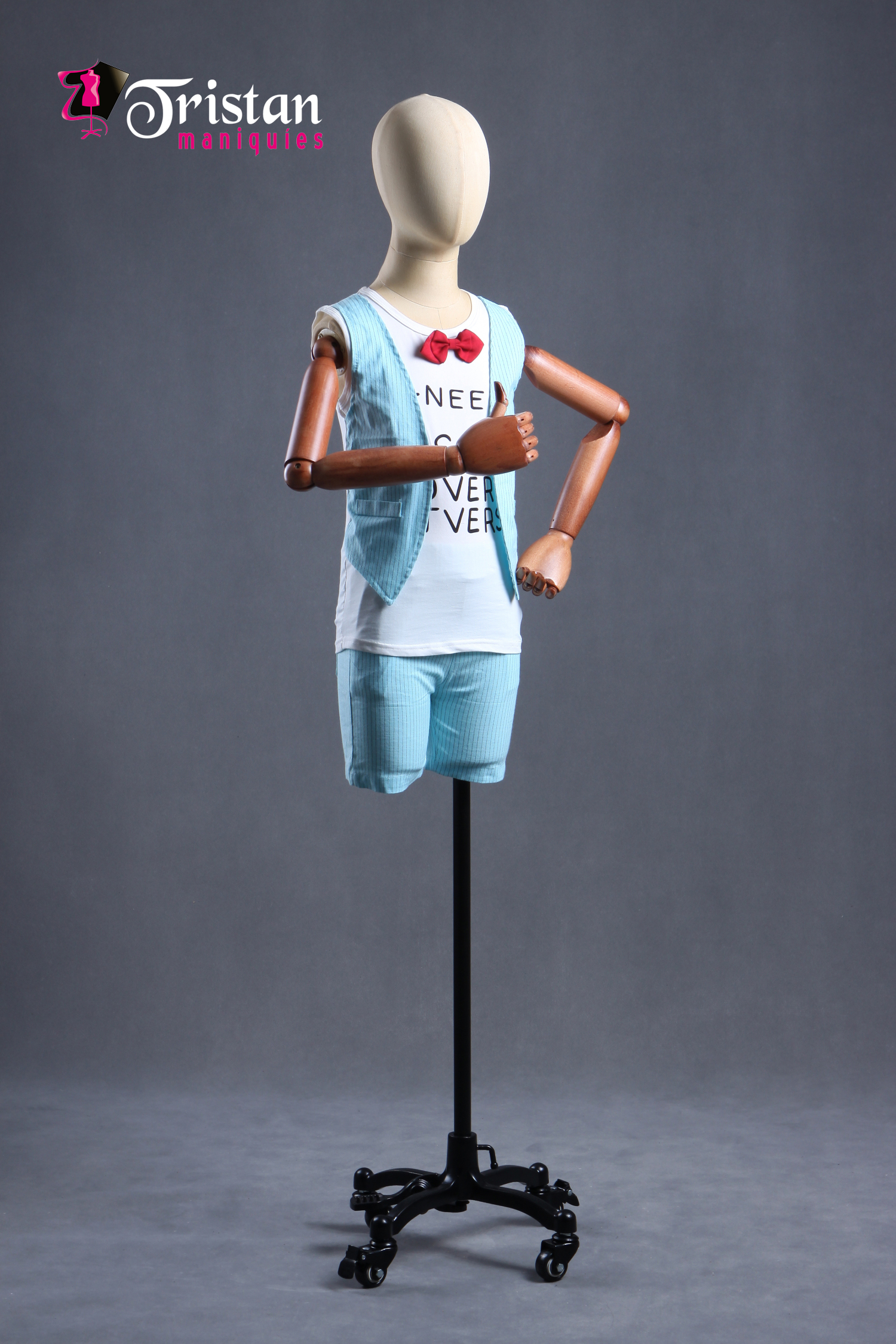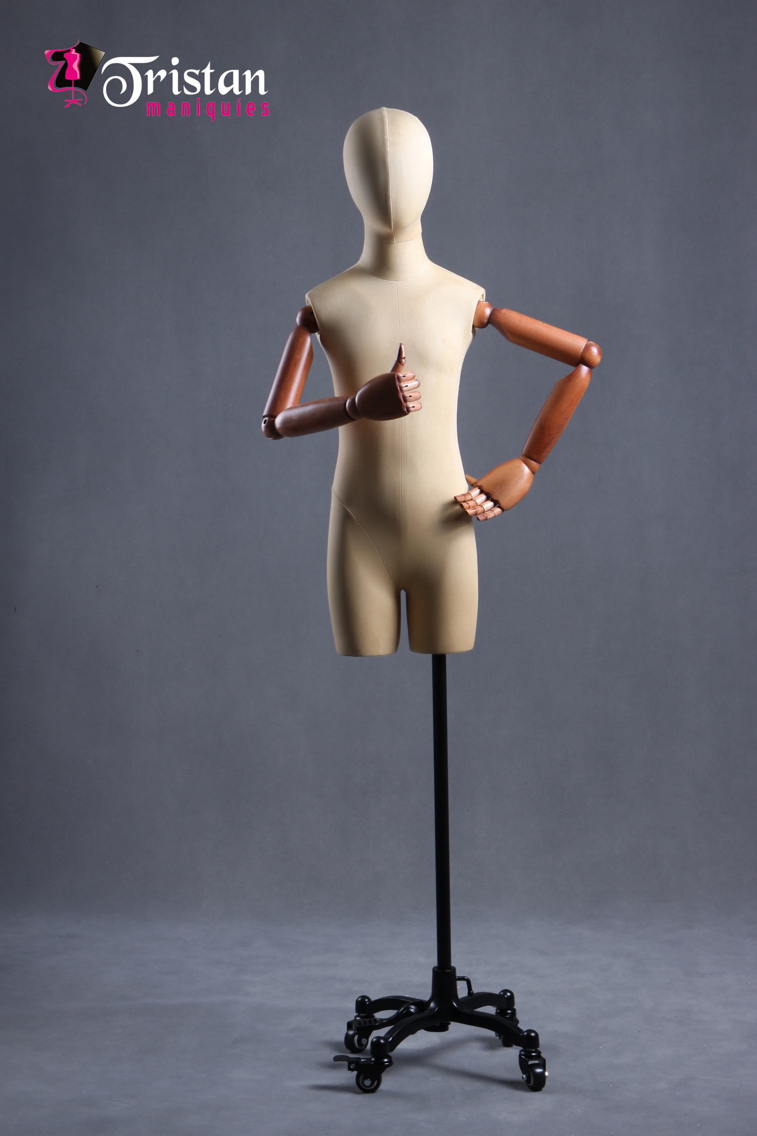 * Maniquí Infantil Unisex de ultima tendencia sin rostro con busto y cabeza de tela Beige, piernas de color gris antracita en fibra de vidrio y brazos y manos de madera articulables para su movilidad y cambio de postura, ademas incluye base de metal cuadrada  y ganchos de sujeción tanto del talón como del gemelo para poder calzarlos.