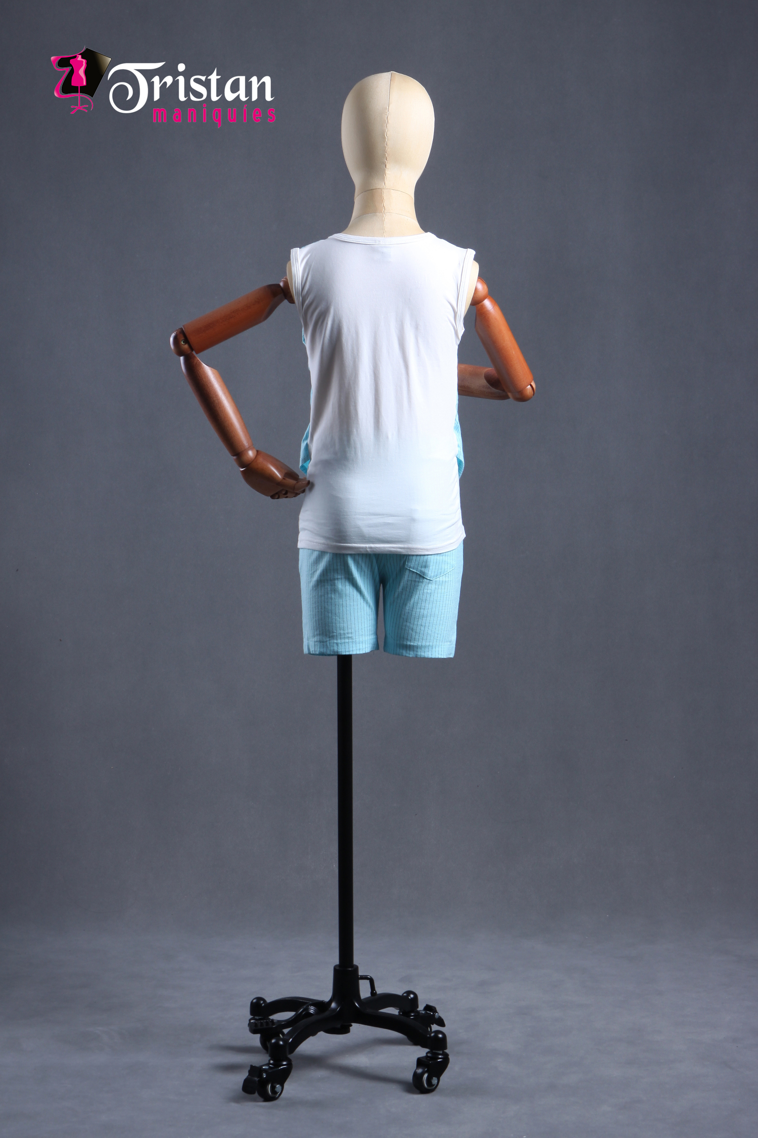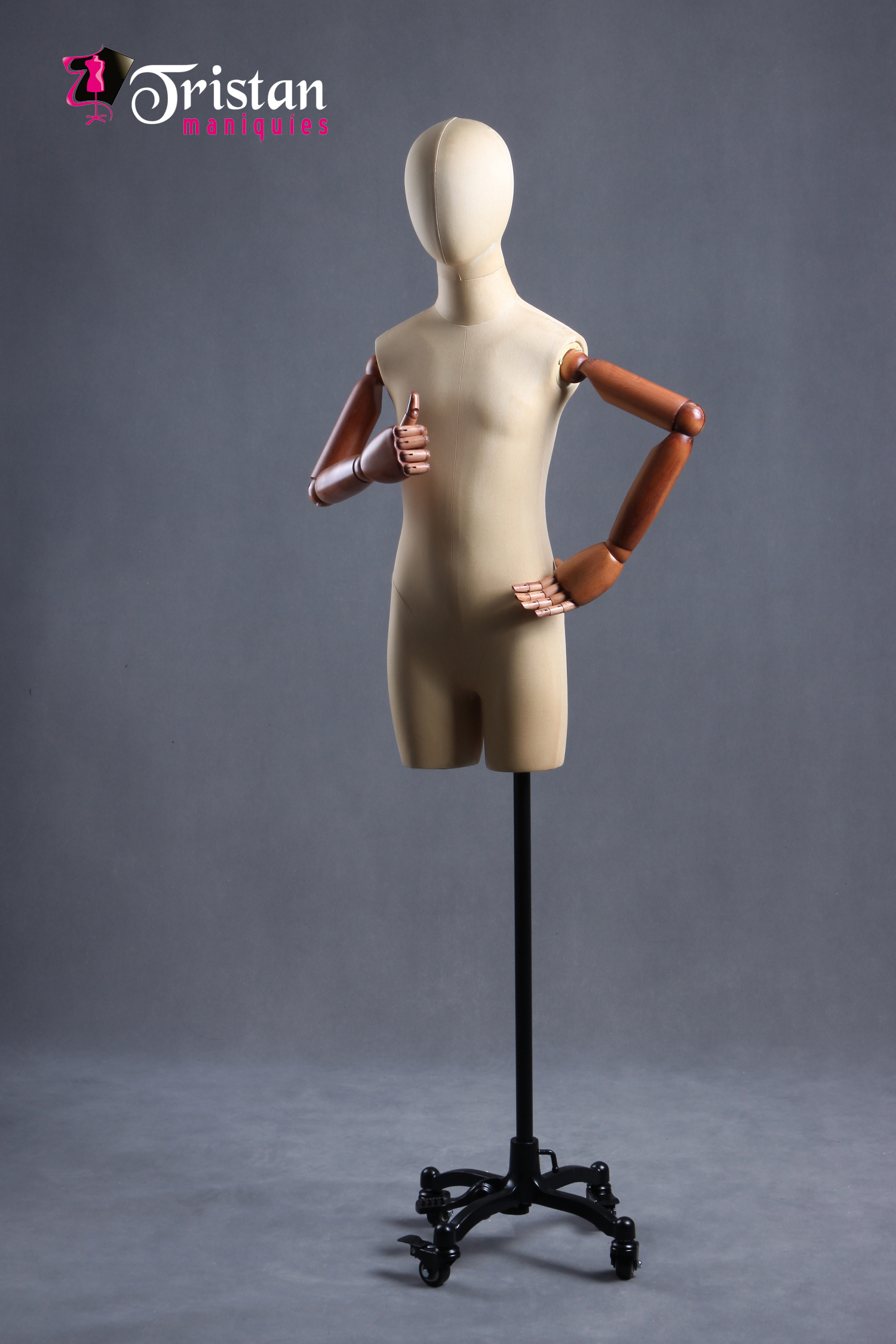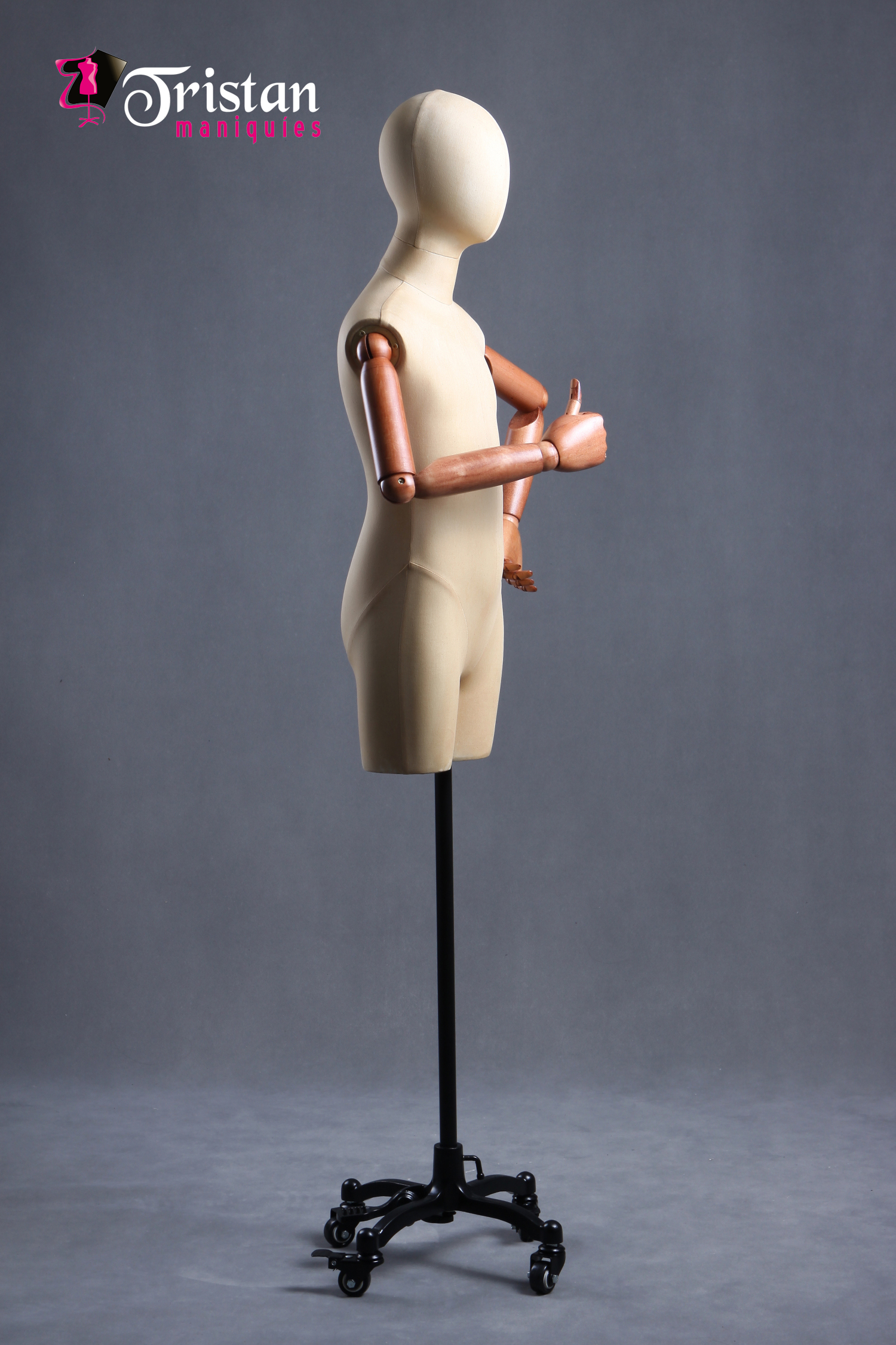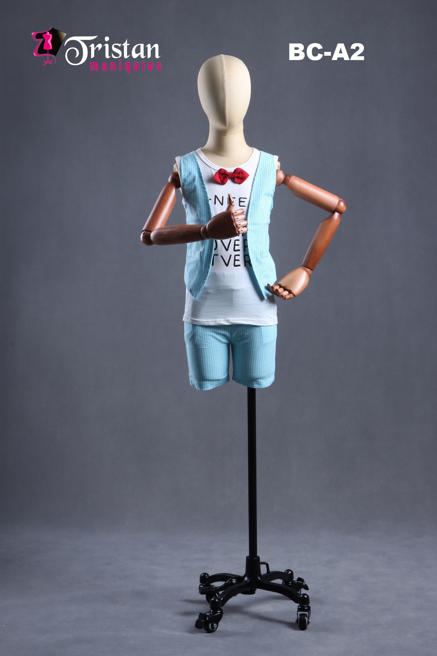 * Maniquí Infantil Unisex de ultima tendencia sin rostro con busto y cabeza de tela Beige, piernas de color gris antracita en fibra de vidrio y brazos y manos de madera articulables para su movilidad y cambio de postura, ademas incluye base de metal cuadrada  y ganchos de sujeción tanto del talón como del gemelo para poder calzarlos.