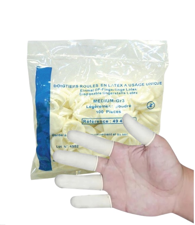 • Dedales de látex desenrollables, no estériles y desechables. Aptos para la protección de los dedos, con talco, antiestáticos.