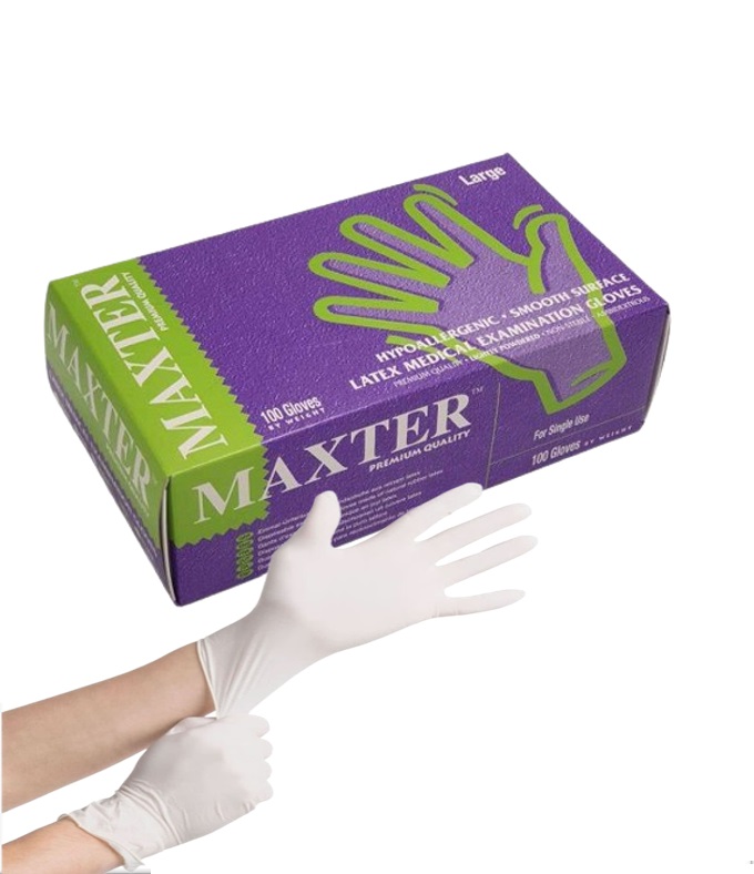 Guantes de Latex con polvo Marca Maxter, estuche de 100 unidades embalaje de 1000 guantes