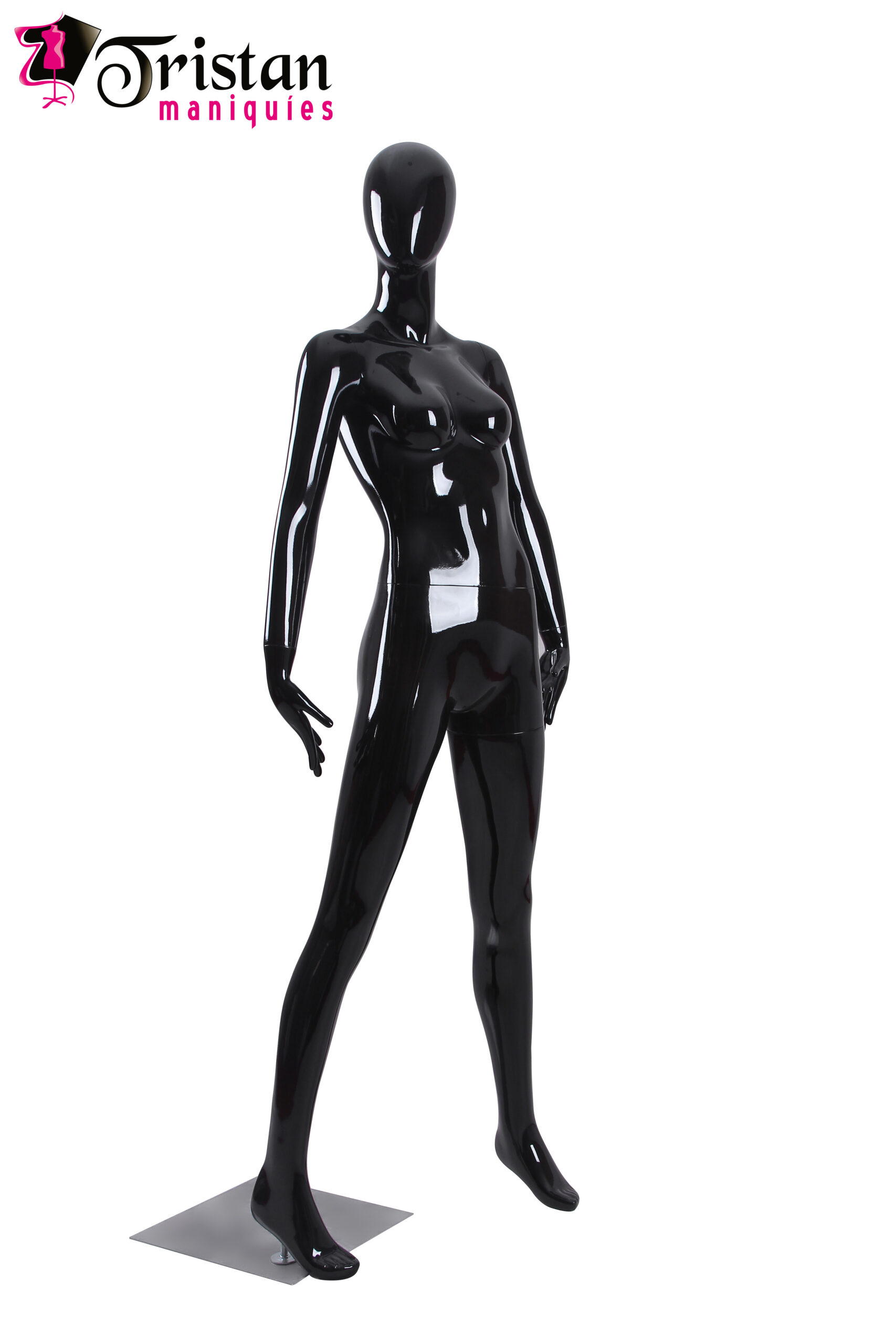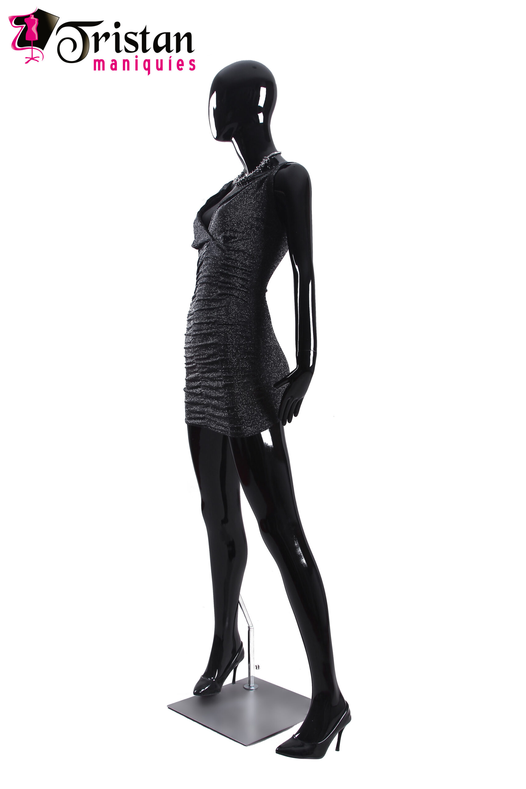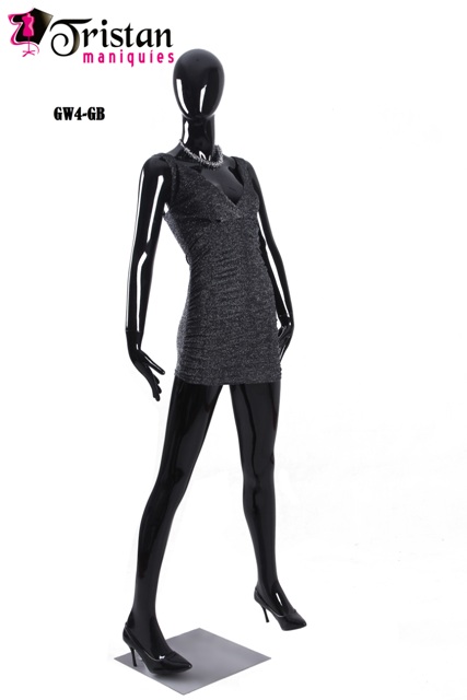 GW4-GB MANIQUI FEMENINO SIN ROSTRO COLOR NEGRO BRILLO, CREADO EN FIBRA DE VIDRIO, INCLUYE BASE DE METAL CUADRADO DE GRAN RESISTENCIA Y DOS GANCHOS DE SUJECCION TALON Y GEMELO PARA PODER CALZARLO.