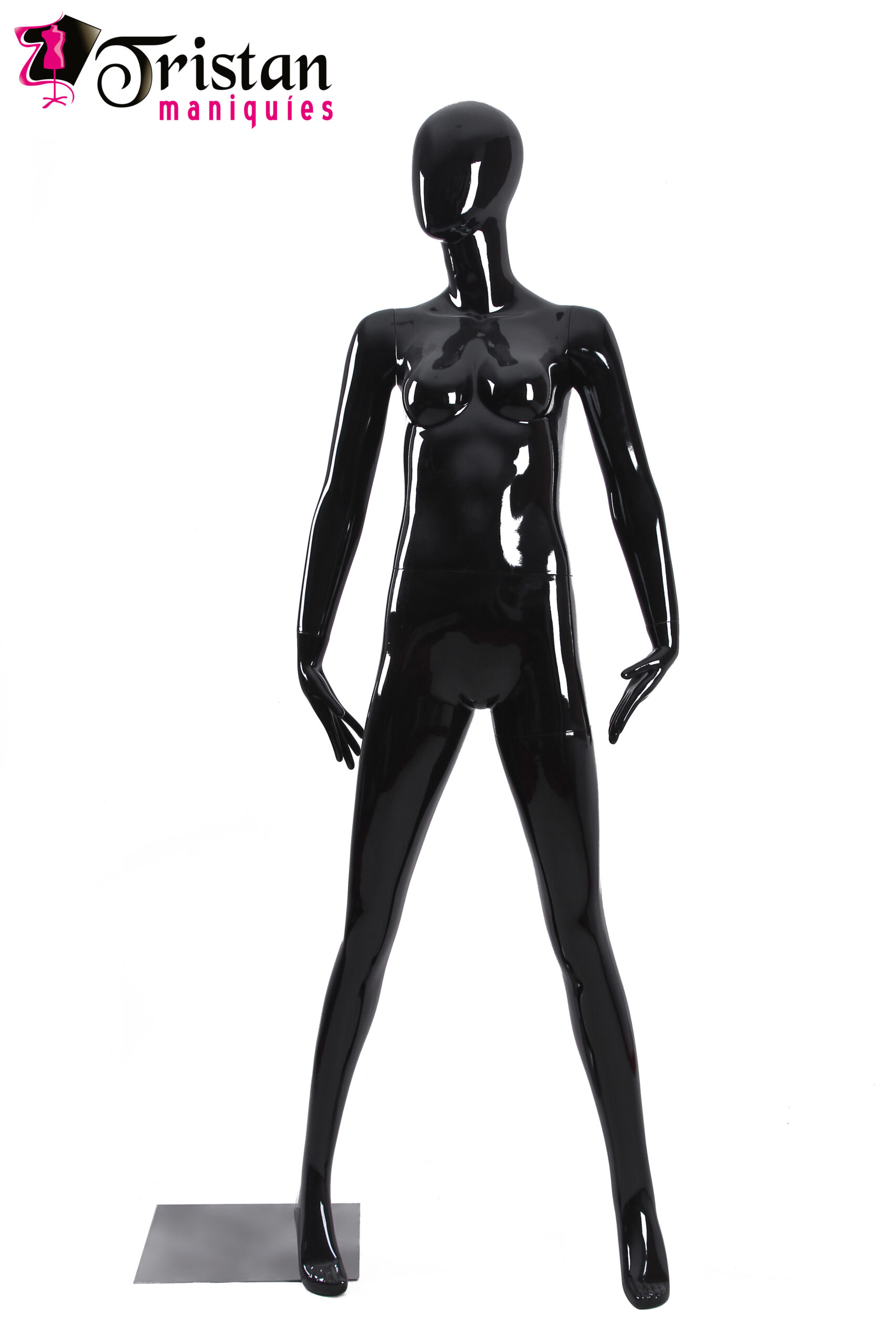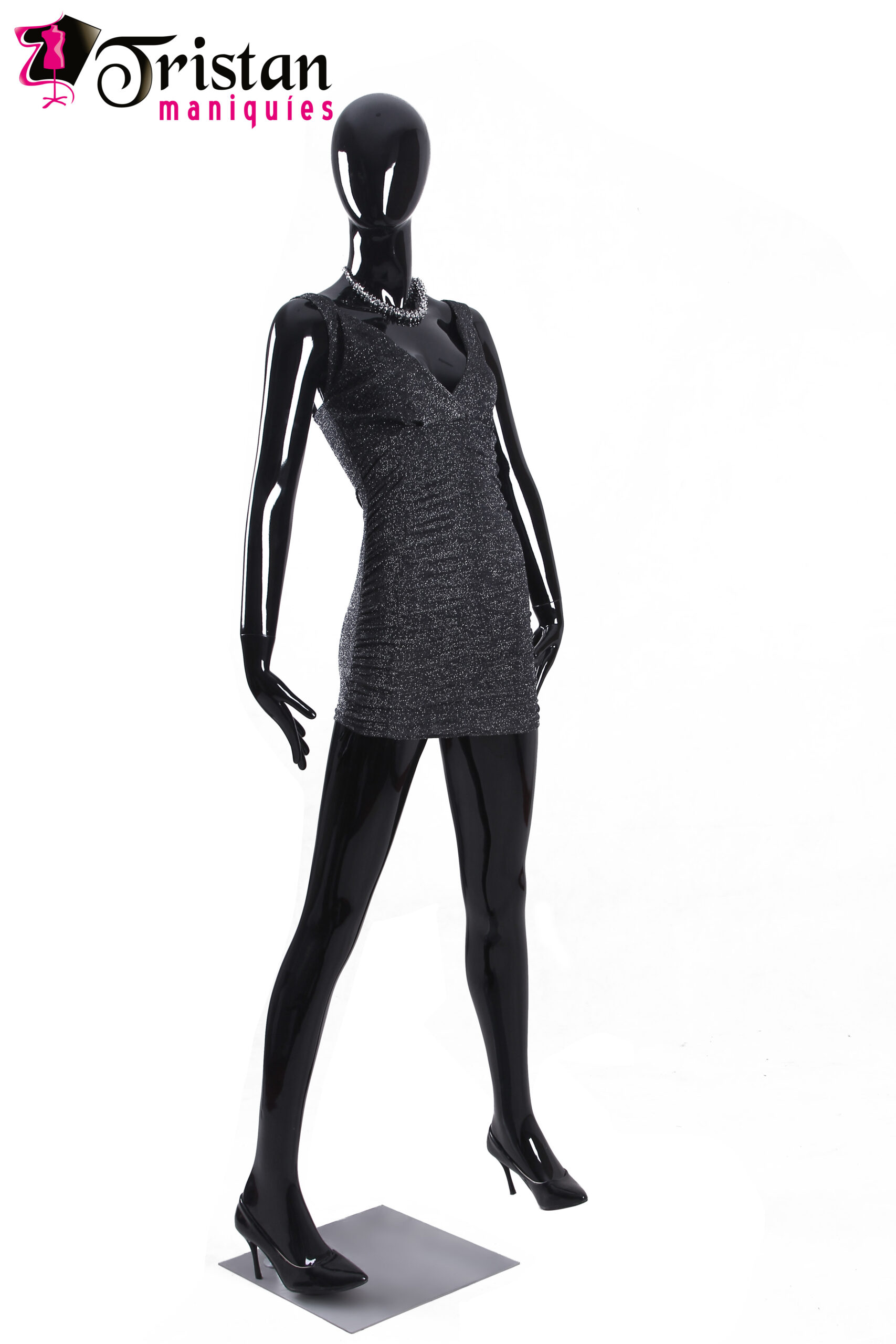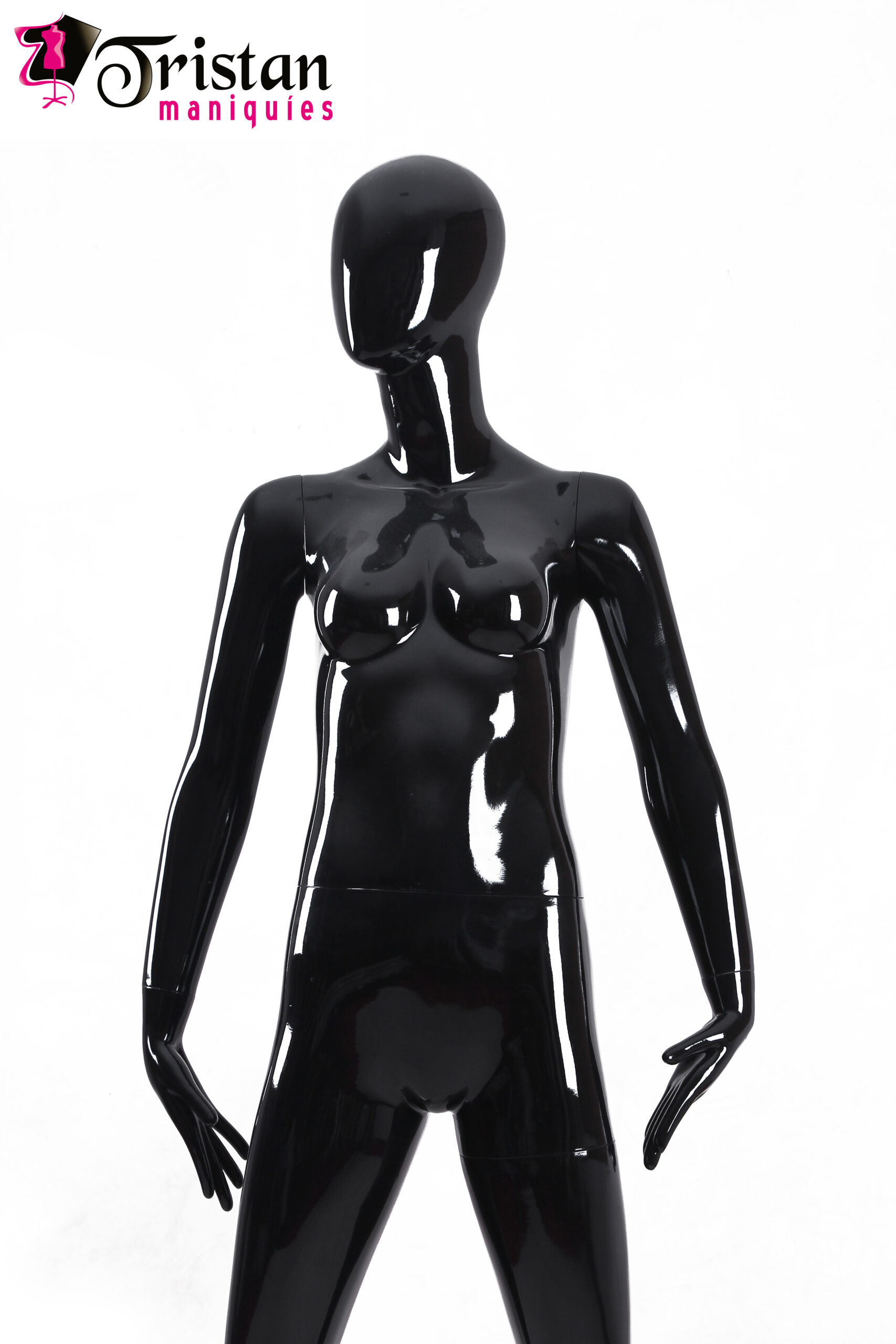 GW4-GB MANIQUI FEMENINO SIN ROSTRO COLOR NEGRO BRILLO, CREADO EN FIBRA DE VIDRIO, INCLUYE BASE DE METAL CUADRADO DE GRAN RESISTENCIA Y DOS GANCHOS DE SUJECCION TALON Y GEMELO PARA PODER CALZARLO.