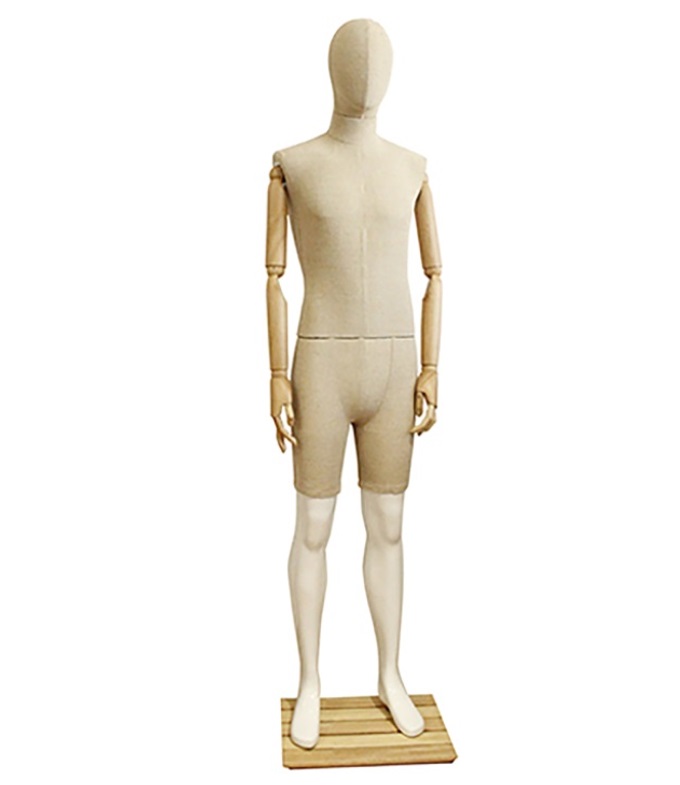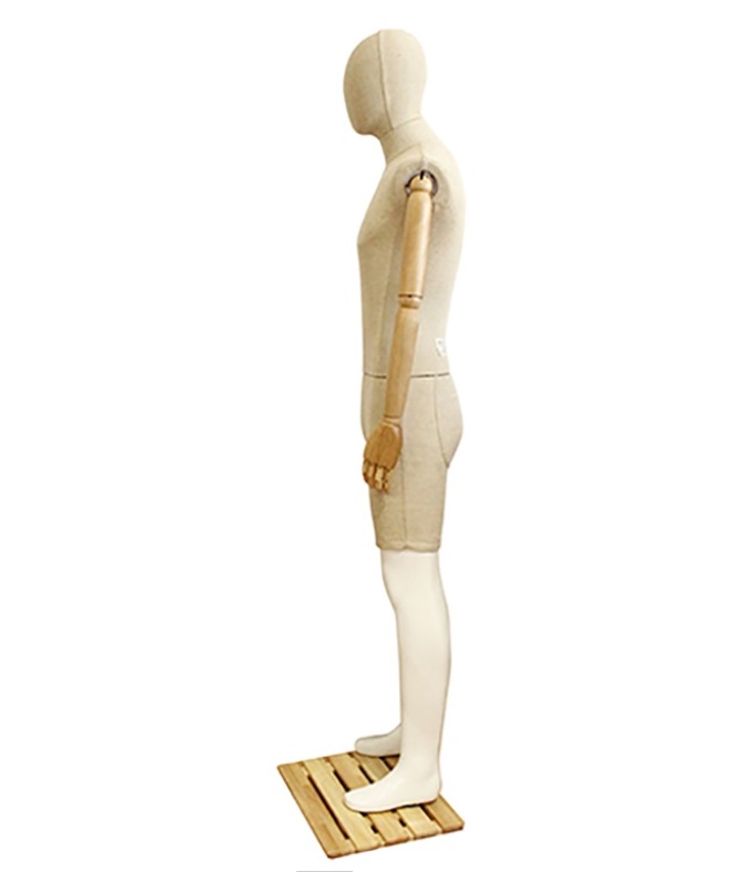 MANIQUÍ DE HOMBRE SIN ROSTRO CON POSE RECTA, BRAZOS ARTICULADOS Y BASE DE MADERA CLARA, PIERNAS EN BLANCO LACADO Y TORSO EN LINO ENVEJECIDO