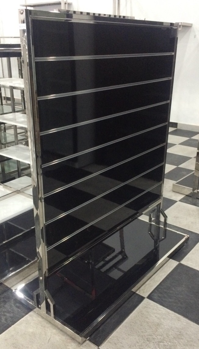 Esta góndola permite crear, junto a dos paneles de lamas de 120 x 120 cm. una isla a dos caras, para centros de tienda o escaparates.