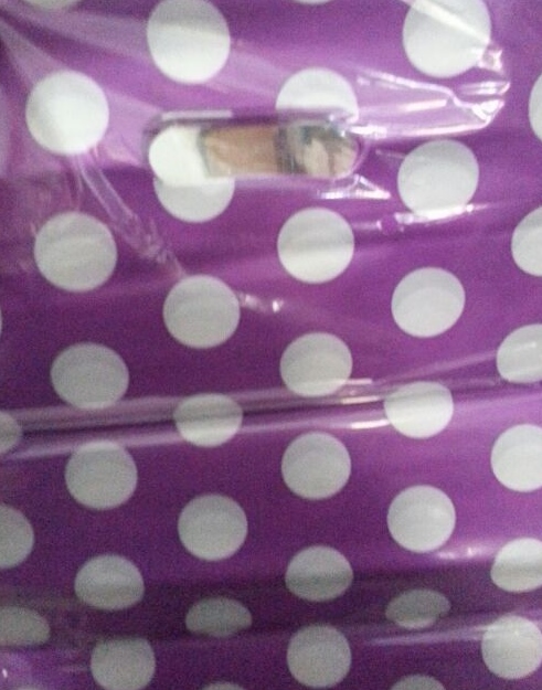 TR-2006-5 PAQUETE 50 PCS BOLSAS ASA TROQUELADA DE PLÁSTICO MODELO MORADO CON TOPOS BLANCOS 50*60